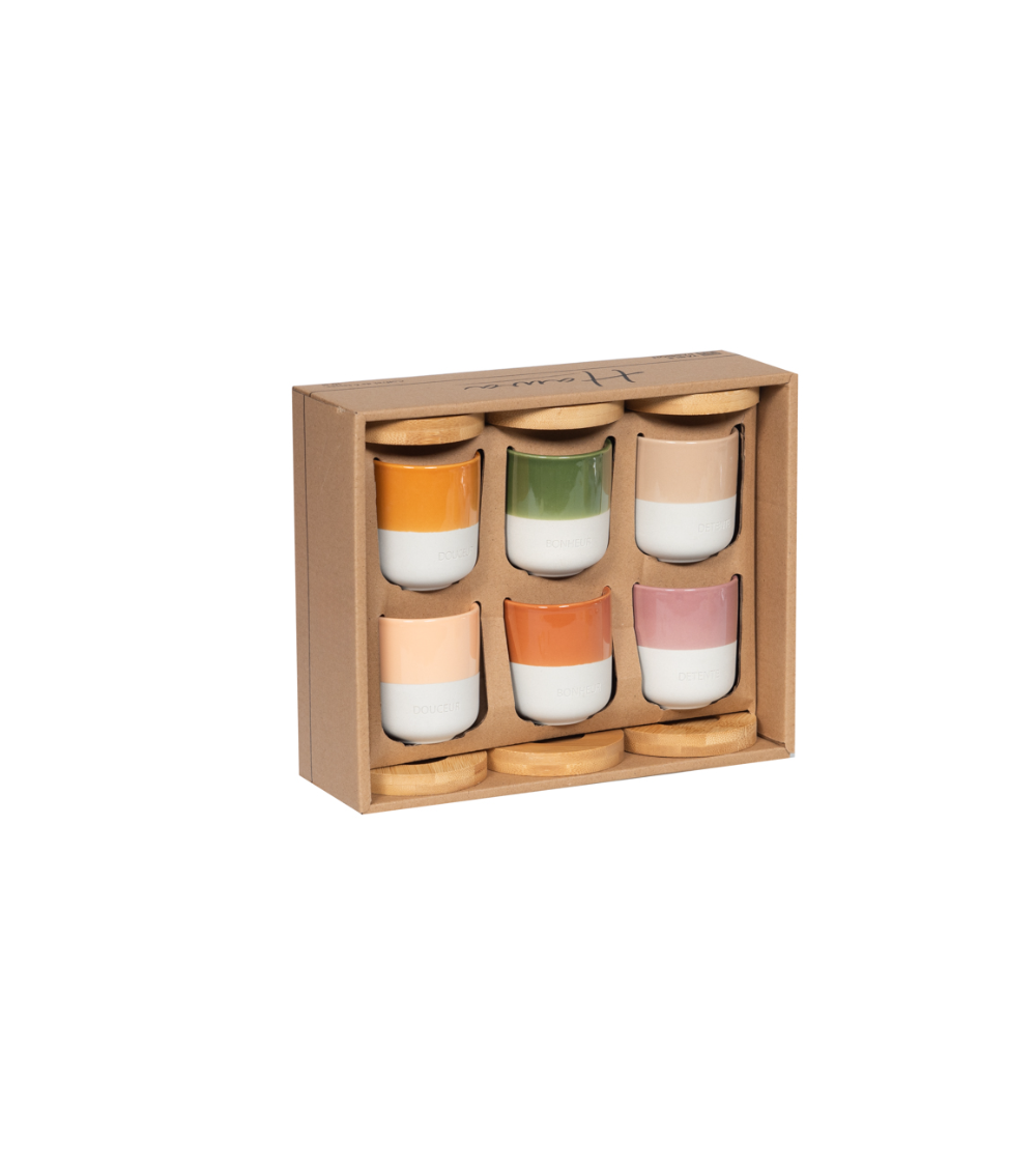 Il s'agit d'un coffret de 6 petites tasses appelées "Hawa", chacune mesurant 6 cm de hauteur. Les tasses ont une partie supérieure colorée et une partie inférieure blanche avec des mots en français comme "BONHEUR", "DÉTENTE" et "DOUCEUR". Elles sont accompagnées de petits dessous de tasse en bambou. C'est un ensemble élégant et coloré, parfait pour servir des boissons chaudes comme le café ou le thé.