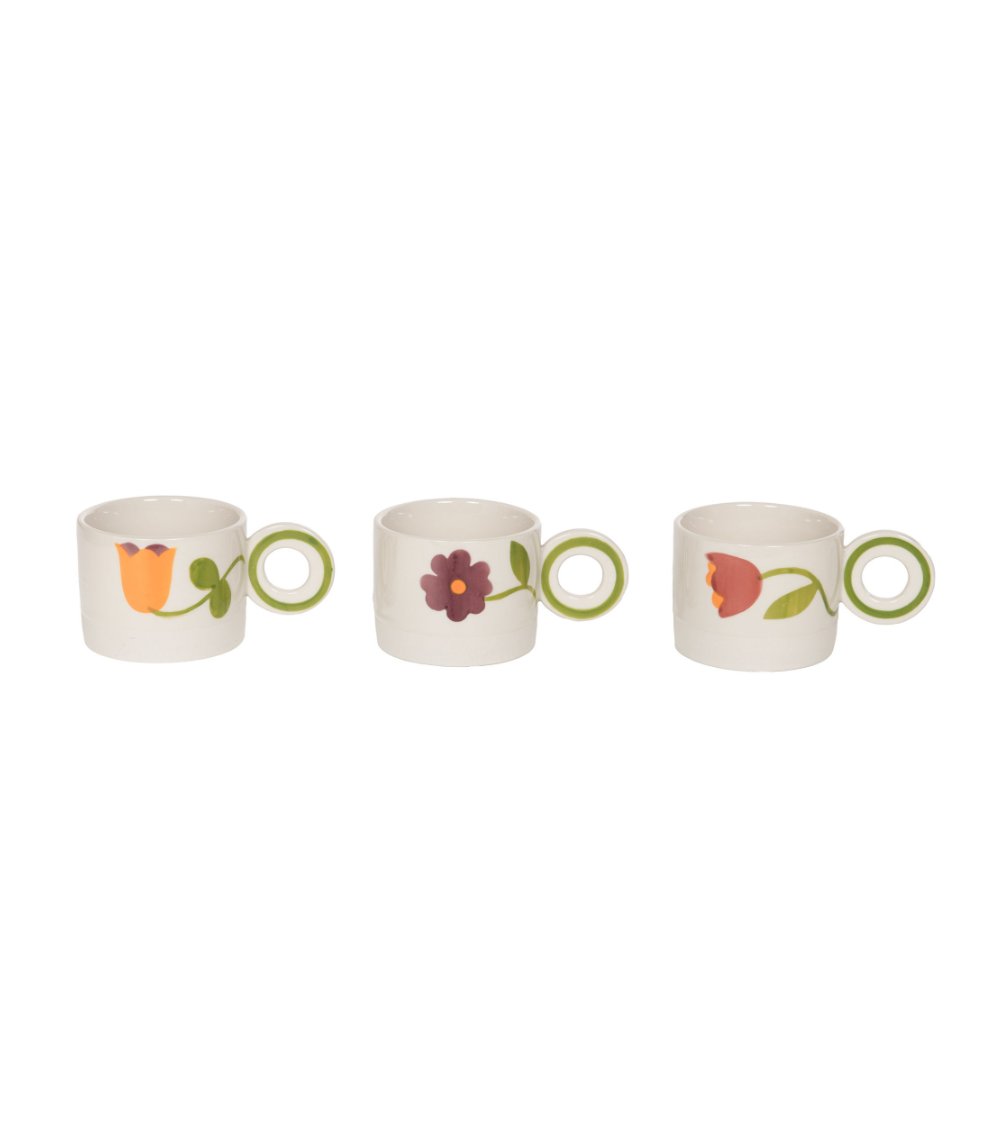 Mug en grès décoré motif floral 'Daphne', vendu en assortiment de 3 modèles. Diamètre et hauteur compactes (L 14 x l 9 x H 7 cm) — format ergonomique et empilable, poids unitaire 390 g. Finition émaillée résistante, adapté à la vente en boutique déco ou cadeau.