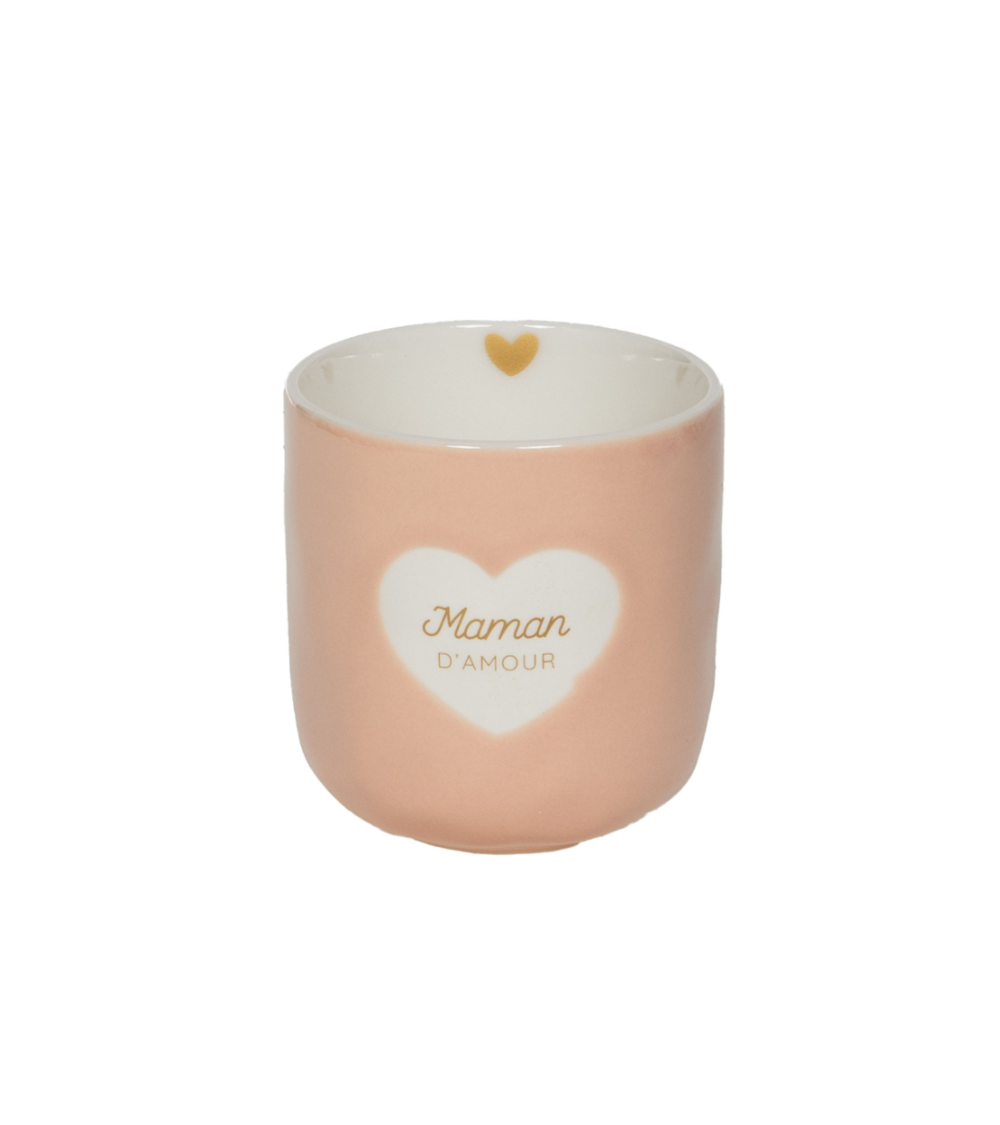 Petite tasse déco au format compact (Ø 8 x H 8 cm) destinée à enrichir une offre cadeau et décoration. Façonnée en céramique émaillée (aspect mat/peau de pêche), elle présente un motif cœur blanc avec lettrage doré « Maman d'amour » et un petit cœur doré intérieur.