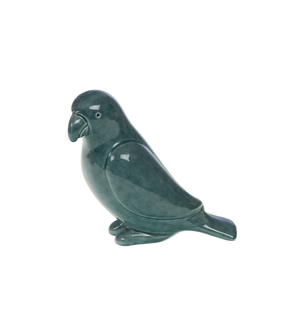 Figurine décorative en céramique émaillée, représentant un perroquet bleu. Compacte (14 cm de hauteur), elle s'intègre facilement dans une gamme d'objets décoratifs animaliers.