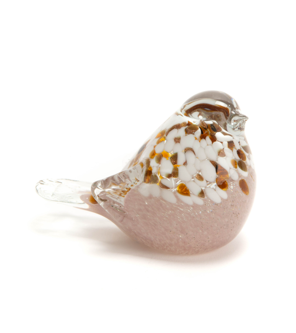 Figurine décorative en verre soufflé, représentant un oiseau mouchéte aux nuances roses et taches blanches et ambrées. Compacte (12x7x9 cm) et légère (290 g), elle s'intègre facilement dans une gamme d'objets d'art ou de décoration raffinée.