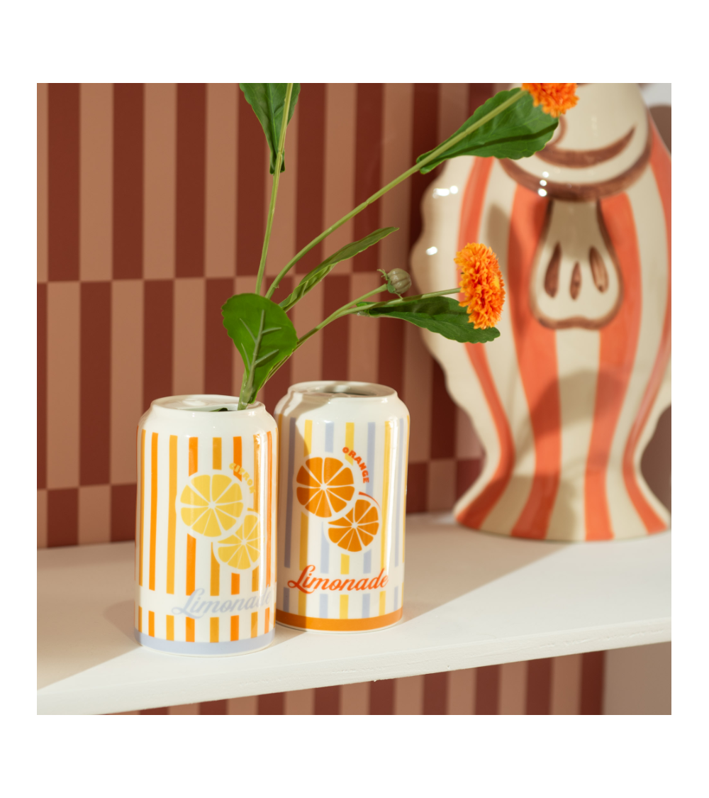 Mini vase en céramique au format « canette », présenté en assortiment de 2 motifs colorés. Dimensions compactes (ø 8 x H 13 cm) et poids léger (440 g) : idéal pour optimiser les fiches produit et proposer un article d'appoint en décoration.